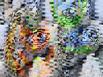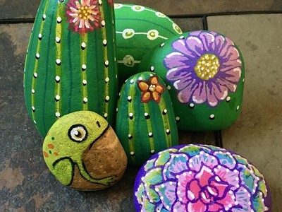Collect or purchase smooth stones and paint abstract images and patterns on them. Black and white acrylic paint works best if you want the stones to have an added 3D or illusion effect.