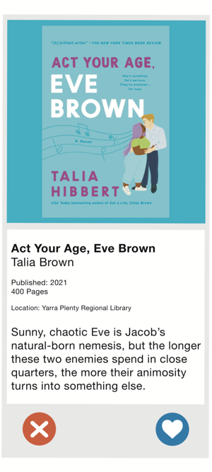 Act Your Age, Eve Brown by Talia Hibbert Eve Brown is a certified hot mess. No matter how hard she strives to do right, her life always goes horribly wrong - so she's given up trying. But when her personal brand of chaos ruins a wedding, her parents draw the line. It's time for Eve to grow up and prove herself - even though she's not entirely sure how. Jacob Wayne is always in control. The B&B owner expects nothing less than perfection from his employees, so when a purple-haired tornado of a woman applies for his open chef position, he tells her the truth: not a chance in hell. Then she hits him with her car - supposedly by accident. Now his arm is broken, his B&B is understaffed, and the dangerously unpredictable Eve is fluttering around, trying to help. Before long, she's infiltrated his work, his kitchen - and his spare bedroom. |
