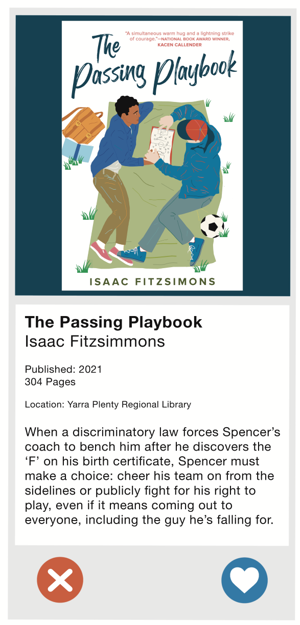 The Passing Playbook, by Isaac Fitzsimmons Fifteen-year-old Spencer Harris is a proud nerd, an awesome big brother and a Messi-in-training. He's also transgender. After transitioning at his old school leads to a year of bullying, Spencer gets a fresh start at Oakley, the most liberal private school in Ohio. At Oakley, Spencer seems to have it all: more accepting classmates, a decent shot at a starting position on the boys' soccer team, great new friends, and maybe even something more than friendship with one of his teammates. |